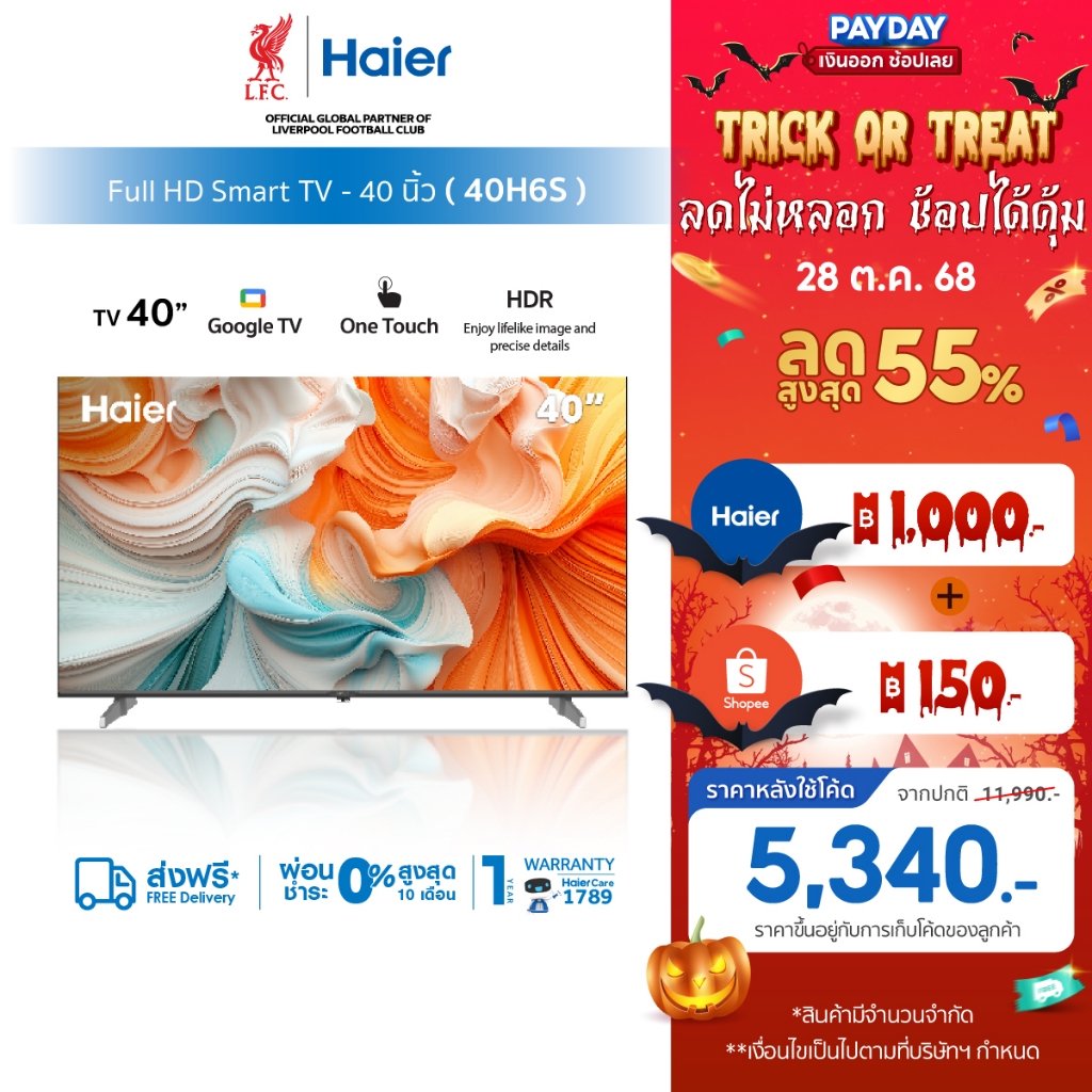 5. [ใช้HAIETVSDAลด1000]Haier TV 40H6S 40" HDR10 Full HD Smart Google TV with Netflix YouTube