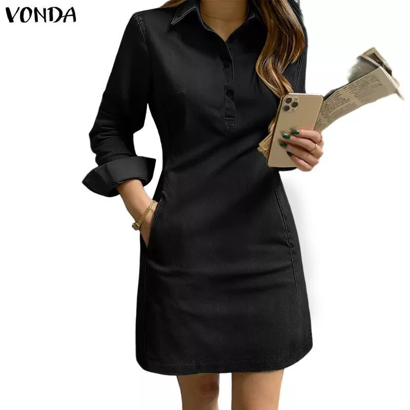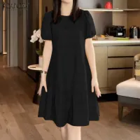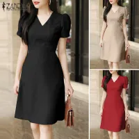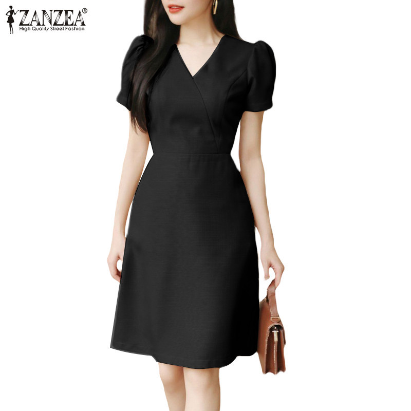 5. ZANZEA ซานเซีย ผู้หญิงแฟชั่นเกาหลีสีทึบพัฟแขนคอวีมินิเดรส