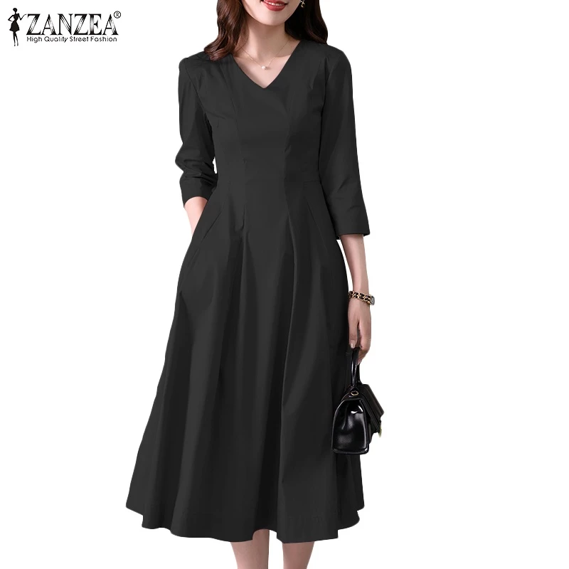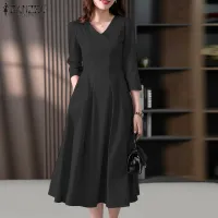 2. Zanzea ชุดเดรส คอวี แขนห้าส่วน สีพื้น สไตล์เกาหลี สําหรับผู้หญิง