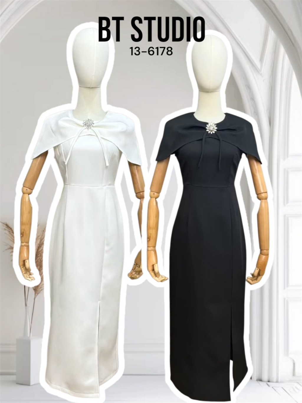 9. BT 13-6178 ชุดเดรสยาวดีเทลปิดคลุมไหล่ด้านในเป็นแขนกุด มาพร้อมเข็มกลัดตรงอก กระโปรงผ่าหลัง