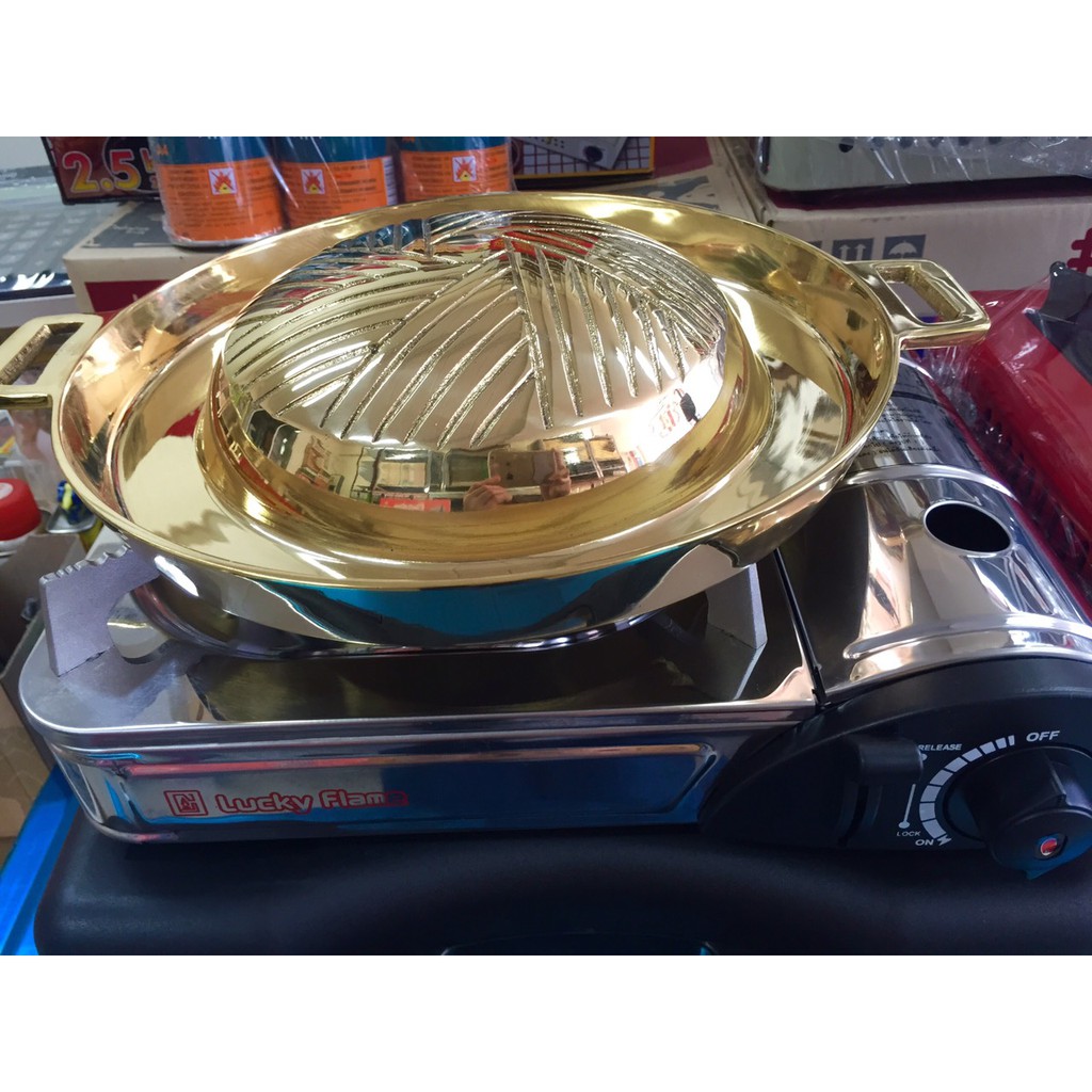 5. หมูกระทะย่างทองเหลือง พร้อม เตาแก๊สกระป๋องลัคกี้เฟลม ผ่อนได้แล้ว