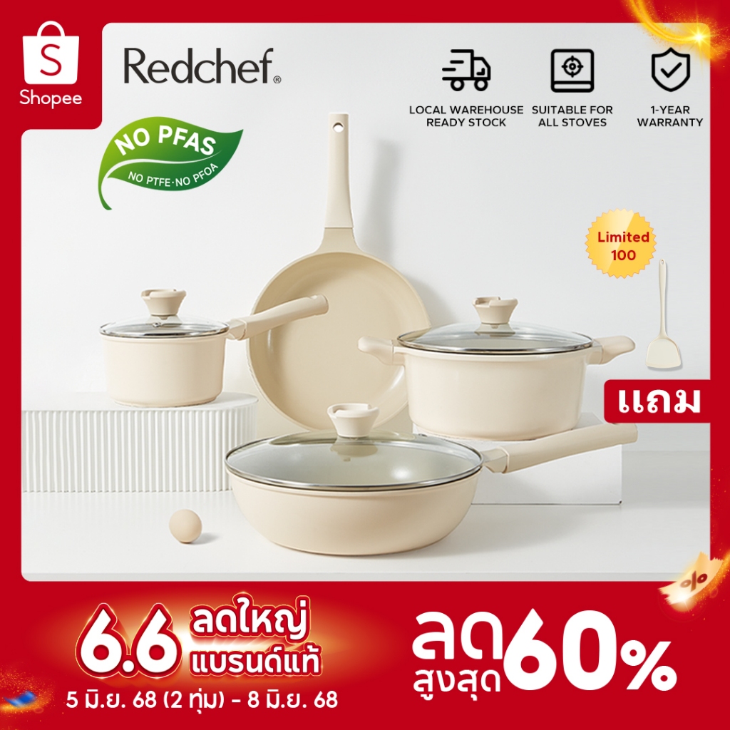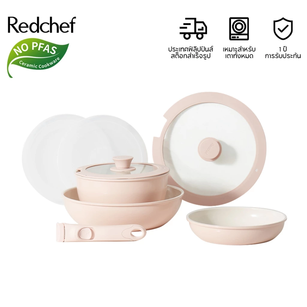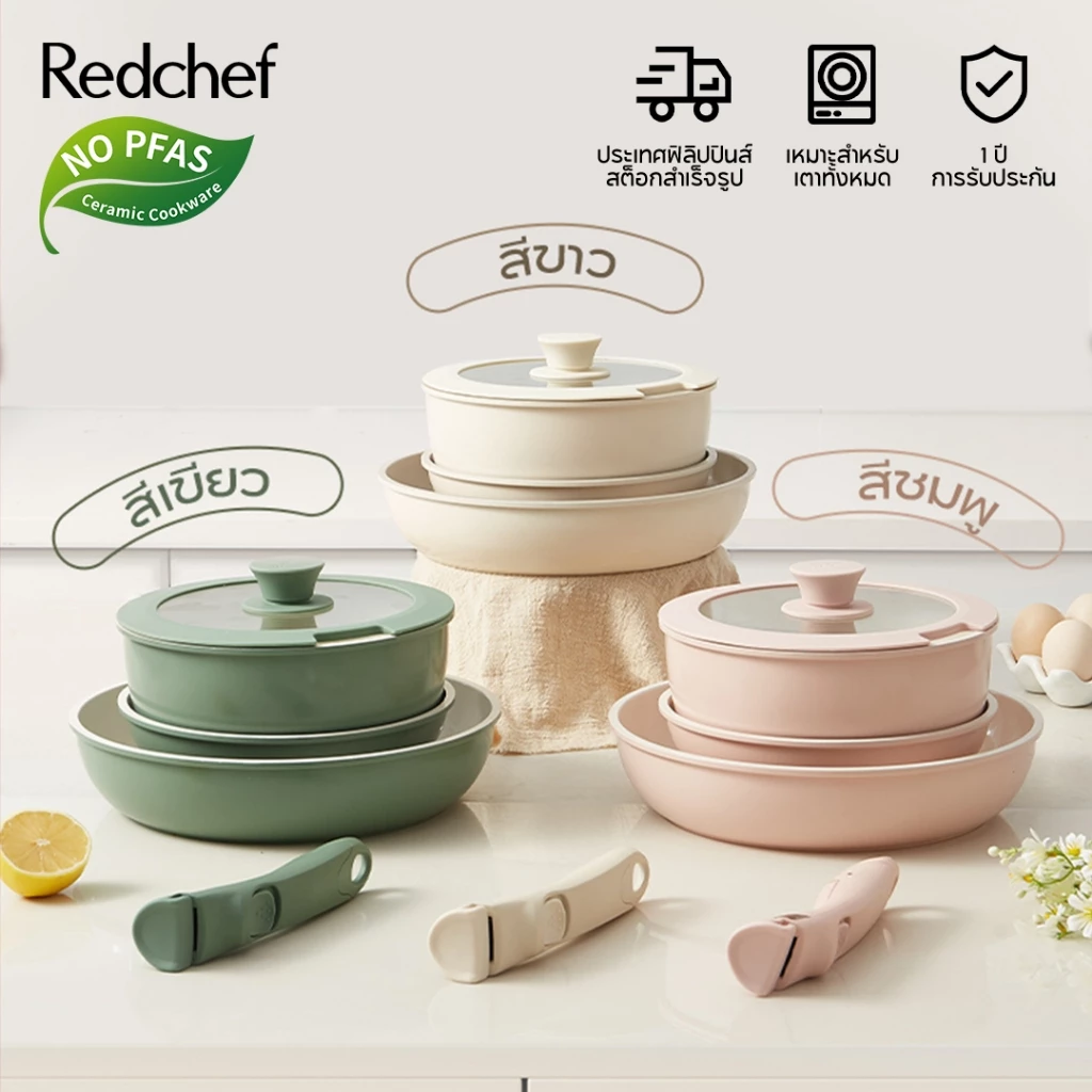 9. Redchef ชุดเครื่องครัวเซรามิค ปลอดสารพิษ PFAS& PTFE& PFOA (กระทะ 28 ซม.+ กระทะ 26 ซม.+ หม้อตุ๋น 24 ซม.+ กระทะ 16 ซม.) 7 ชิ้น