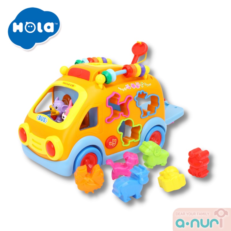 7. Hola [HuileToys] รถโรงเรียนสัตว์ Happy Bus with block รถบัสหยอดบล็อก ชนถอย มีเสียงเพลง มีไฟ ของเล่นเสริมพัฒนาการ