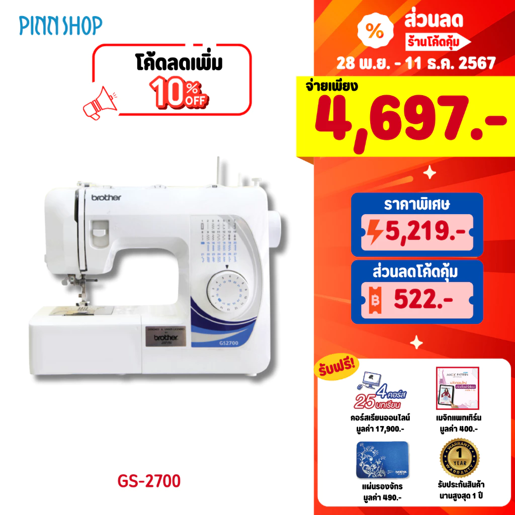 6. Brother จักรเย็บผ้า รุ่น GS2700 (แถมฟรี ตีนผีพื้นฐาน 5 ชิ้น) ตะเข็บภายในเครื่อง 27 ลาย