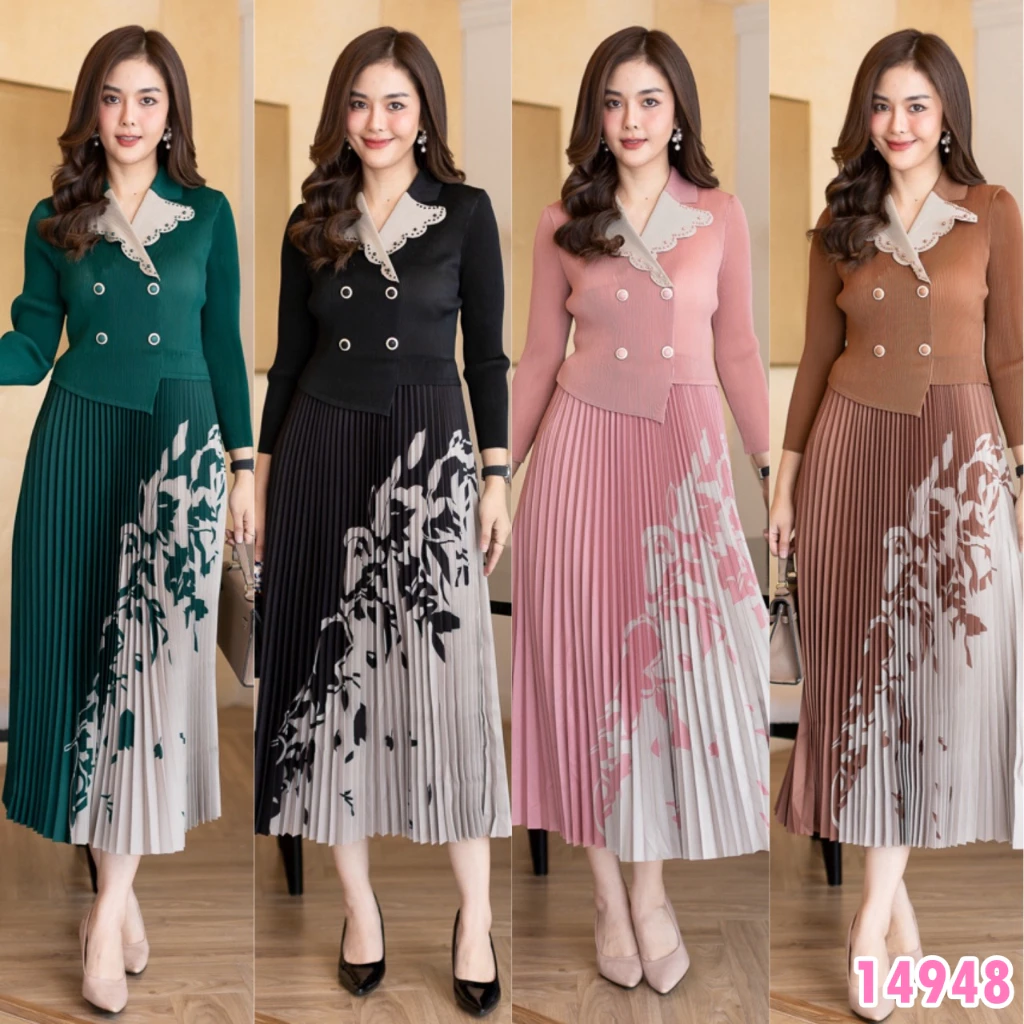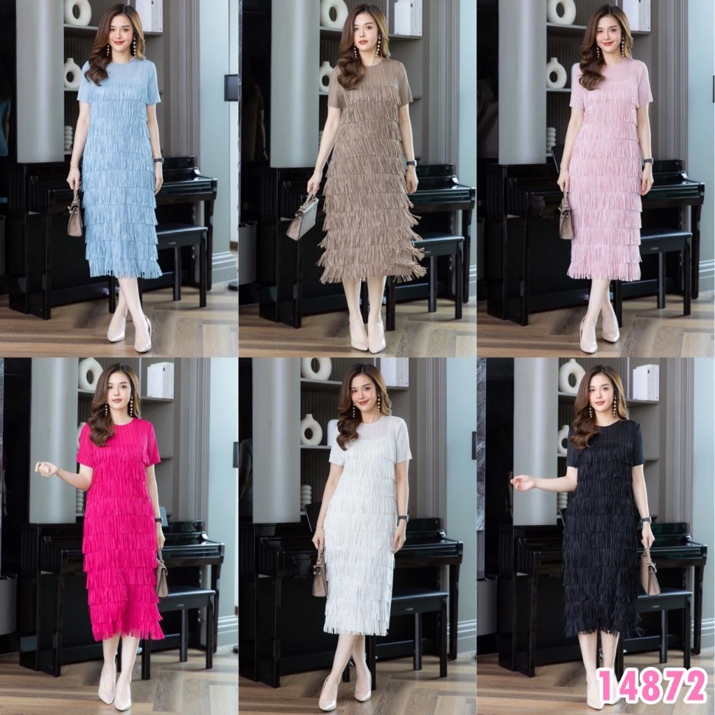 4. 14872 Cutie Minute เดรสผ้าอัดพลีท Premium งานแต่งพู่ดีเทลเก๋ๆ แขนสั้น เดรสมีแต่งพู่ทั้งตัว ทรงสวยเข้ารูป