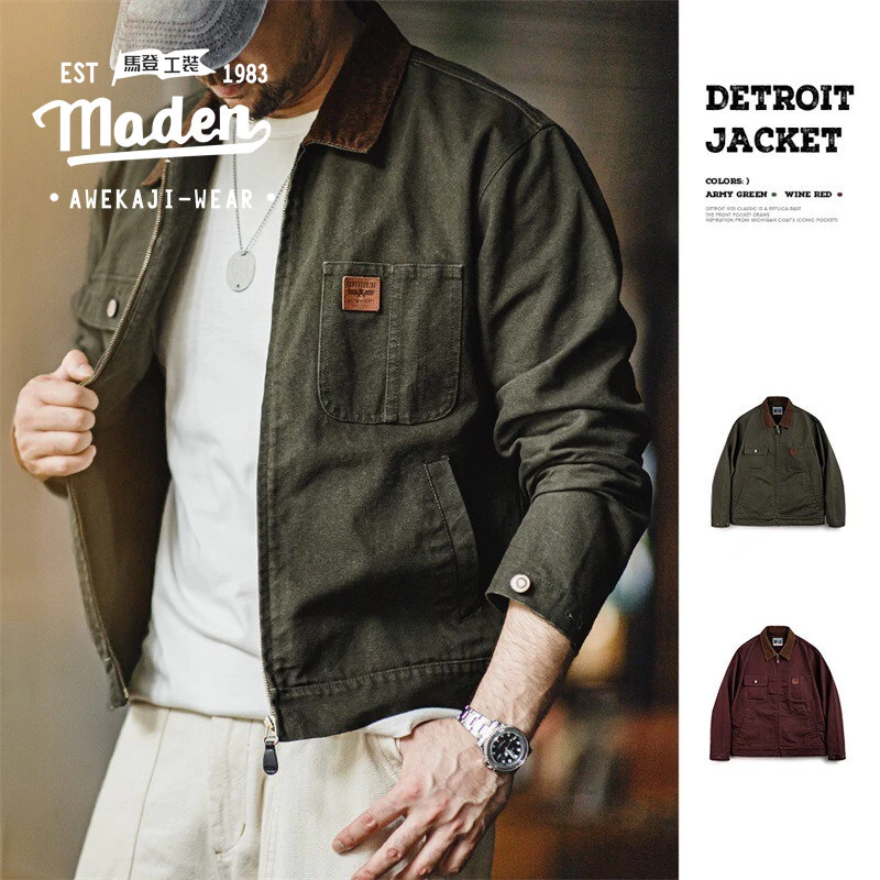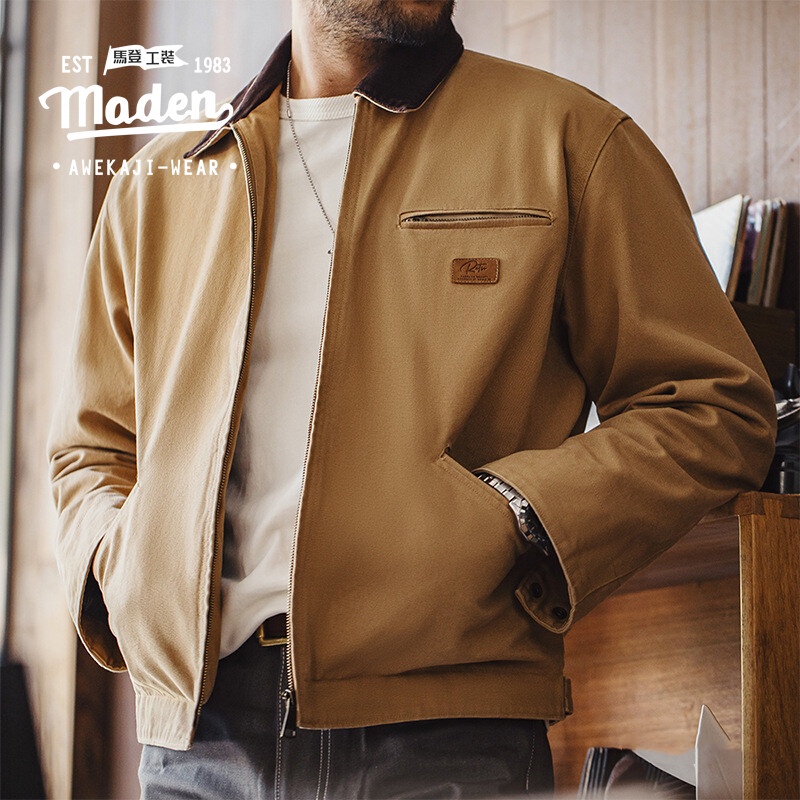 5. MADEN อาหาร ยี่ห้อทํางานสไตล์ผู้ชายเยาวชน 2025 ฤดูใบไม้ร่วงใหม่คนเหนียวอเมริกันย้อนยุคดีทรอยต์แจ็คเก็ต อามิกานี หนักผ้าใบปกแจ็คเก
