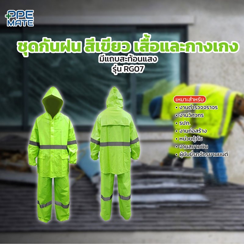 6. ชุดกันฝนสีเขียว เสื้อ-กางเกง มีแถบสะท้อนแสง รุ่น RG07 | งานจราจร | งานกู้ภัย | พนักงานสนามบิน
