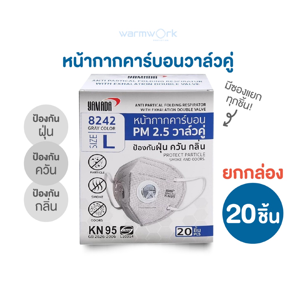 2. (มีซองแยกทุกชิ้น) หน้ากากคาร์บอนวาลว์คู่ YAMADA 8242 (KN95) 20 ชิ้น/กล่อง หน้ากากกันฝุ่น ควัน กลิ่น ทรงV-shape แนบใบหน้า