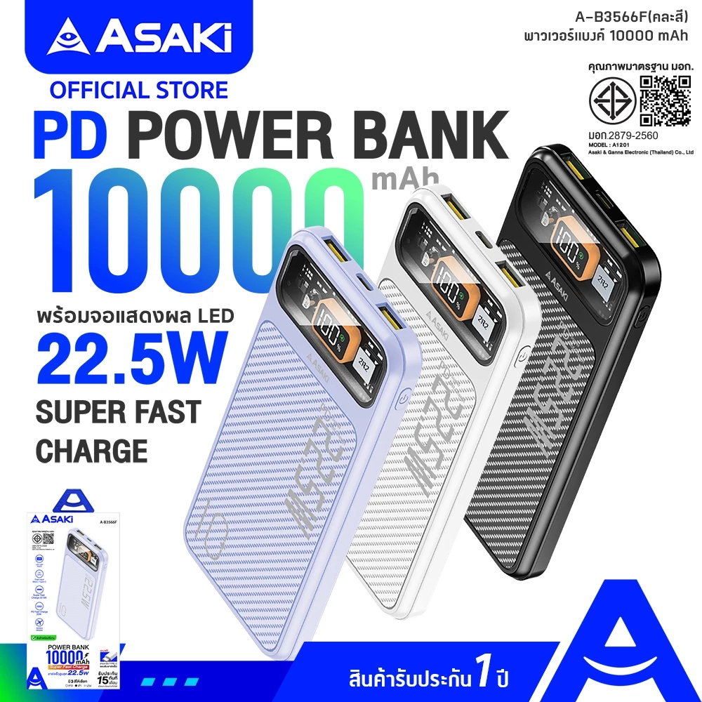 6. Asaki Powerbank 10000mAh พาวเวอร์แบงค์ มอก. 22.5w จอ LED สายชาร์จ2IN1 รุ่น A-B3566F