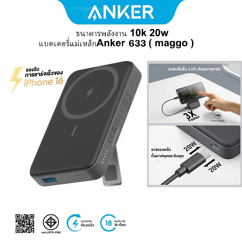 5. Anker 633 Magnetic Battery (MagGo) 10000 mAh พาวเวอร์แบงค์ แบตสำรองไร้สาย ชาร์จแม่เหล็ก พร้อมขาตั้ง