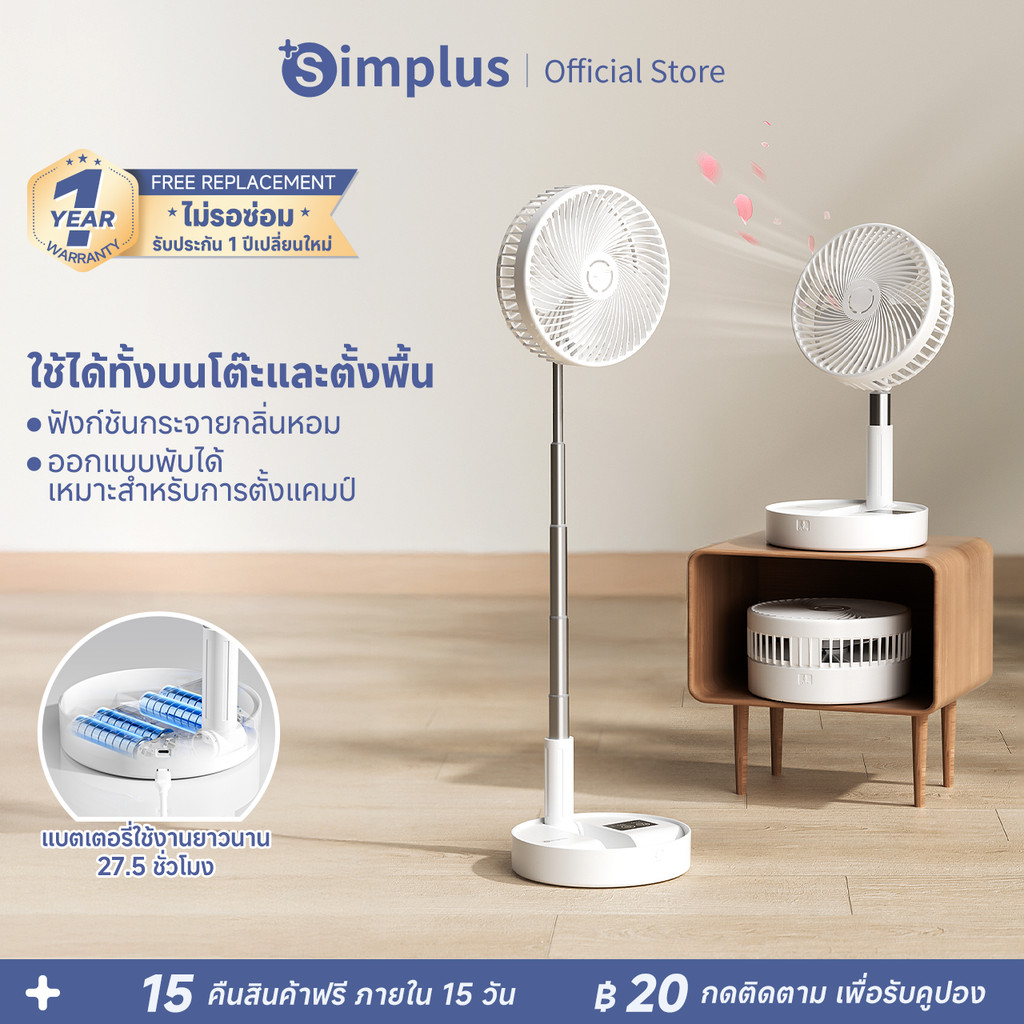5. Simplus พัดลมตั้งโต๊ะ พัดลมตั้งพื้น พับเก็บได้ อโรมา แบต 8000mAh ใช้นาน 27.5ชม ตั้งเวลาได้ DFSH017