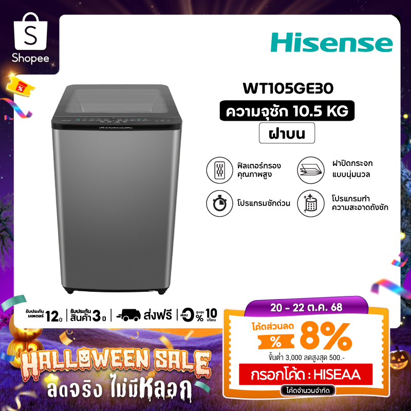6. Hisense เครื่องซักผ้าฝาบน สีเทา รุ่น WT105GE30 ความจุ 10.5 กก.