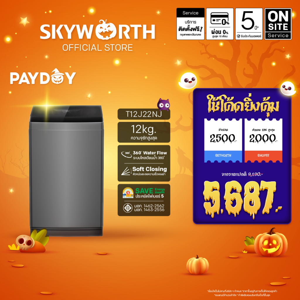 1. จัดส่งฟรี SKYWORTH เครื่องซักผ้าฝาบน T12J22NJ ซัก 12 กก.