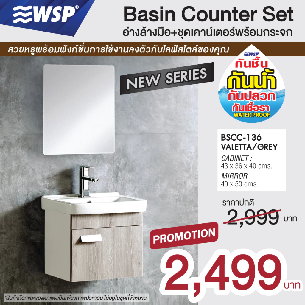 5. WSP อ่างล้างมือ+ชุดเคาน์เตอร์พร้อมกระจก Basin Counter Set รุ่น BSCC-136 (VALETA/GREY)