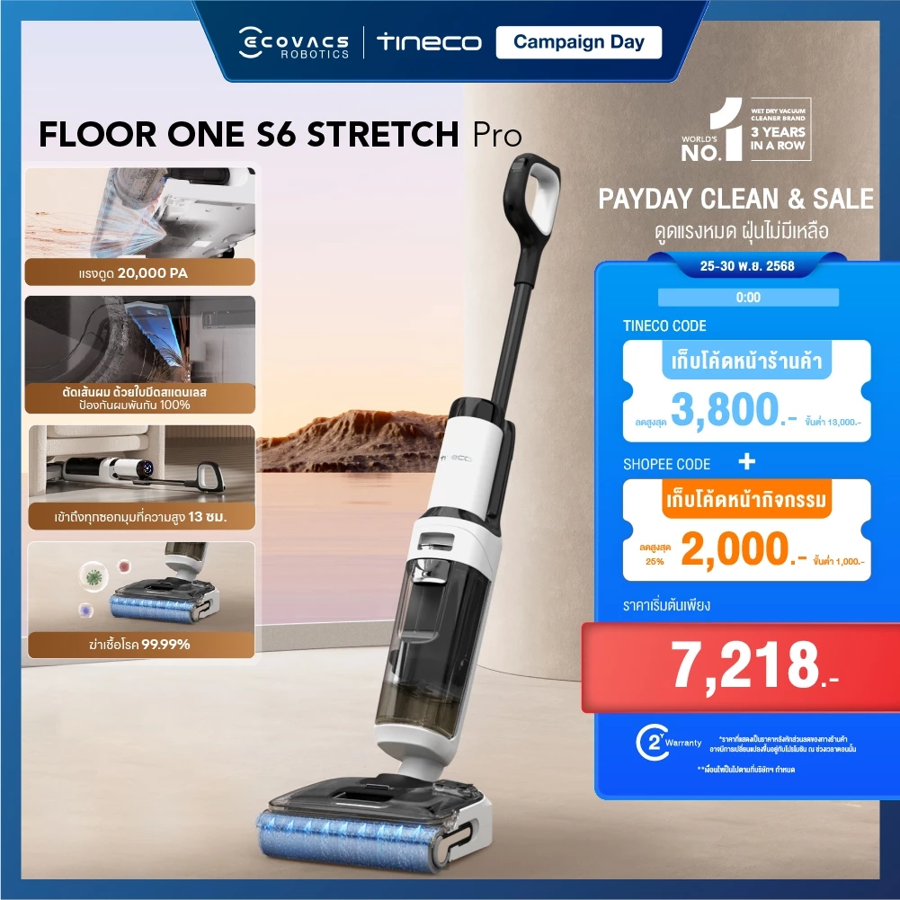 9.NEW! Tineco S6 Stretch Pro เครื่องล้างพื้น ไร้สาย อัจฉริยะ Floor Washer พลังดูด 20,000 Pa