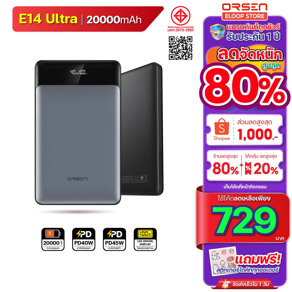 - Orsen Eloop รุ่น E14 Ultra แบตสำรอง Power Bank 20,000 mAh 45W Max รองรับชาร์จเร็ว